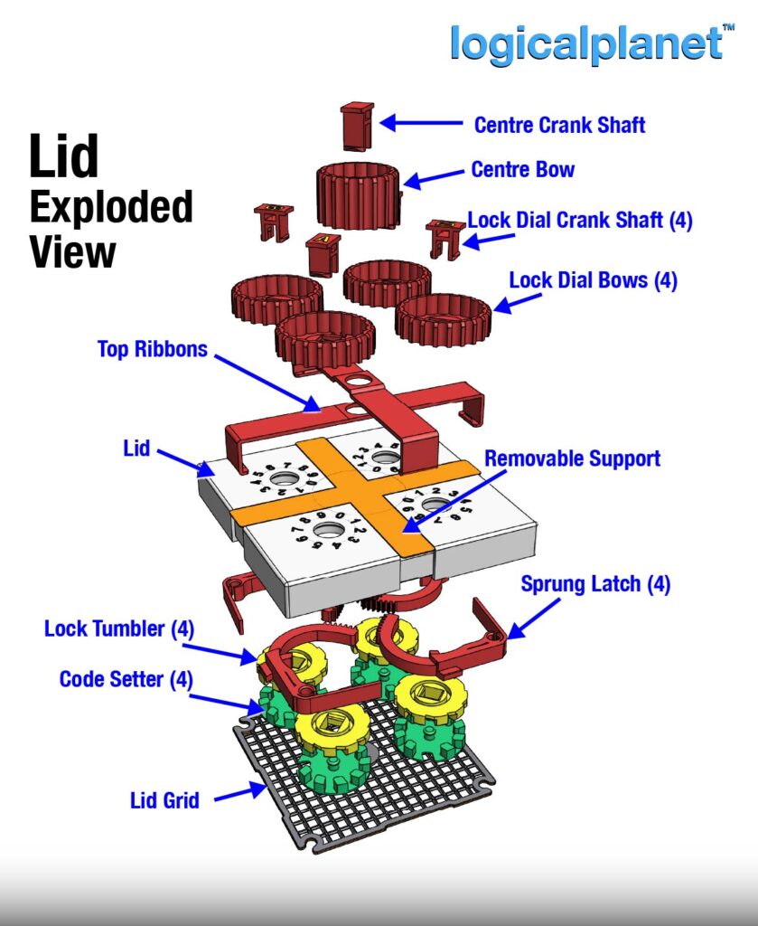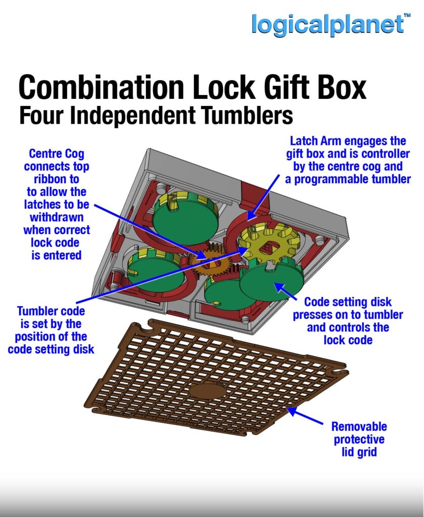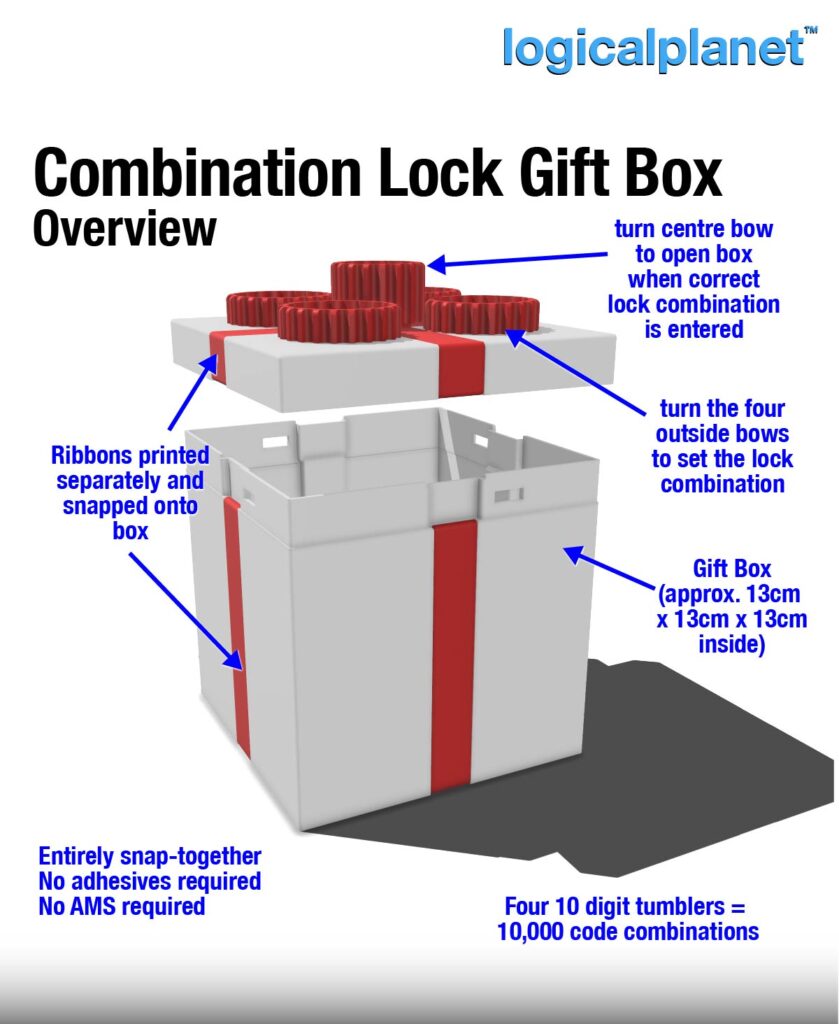 The entire lock system is incorporated into the lid of the gift box. The four outside “ribbons” on the top of the box are each a lock dial. You use those to the combination code which opens the box. Since there are 10,000 possible combinations you need to know it to open it. Then once the correct code is entered via those ribbons, the central ribbon can be turned to release the lid from the gift box body.