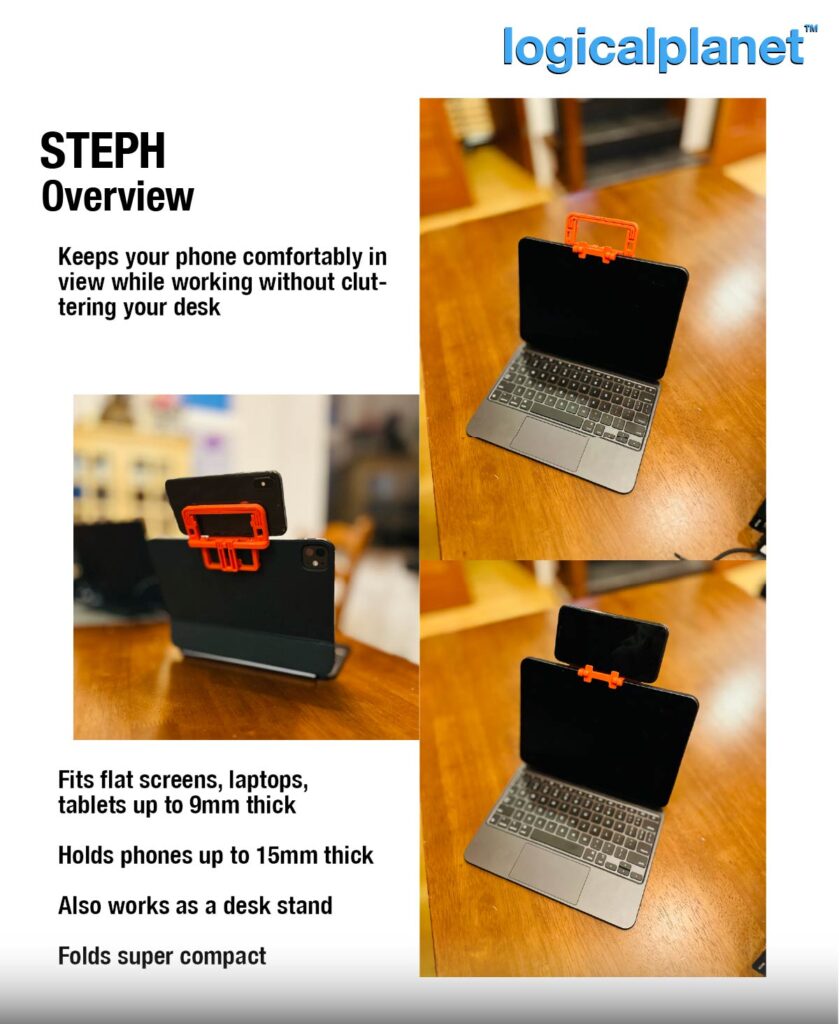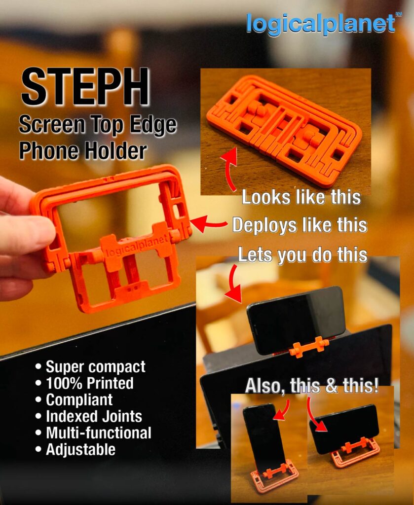 STEPH is a compact, 3D-printed, print-in-place phone holder that mounts directly on the top edge of laptops, flat monitors, and tablets.