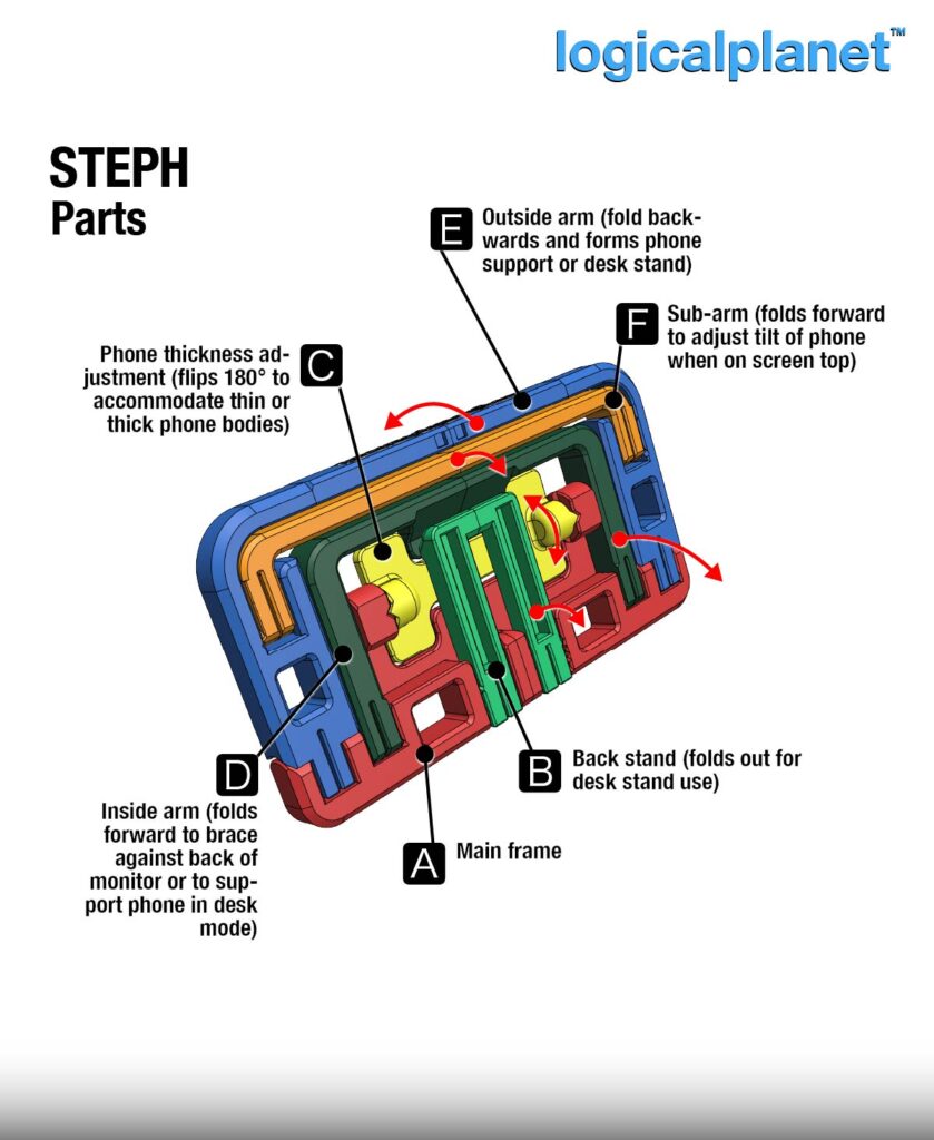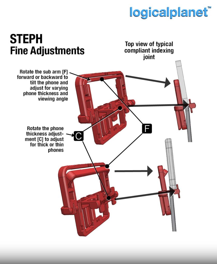 Fine adjustment features allow STEPH to accommodate different phone thicknesses — with or without a case — as well as small viewing angle changes for comfort.