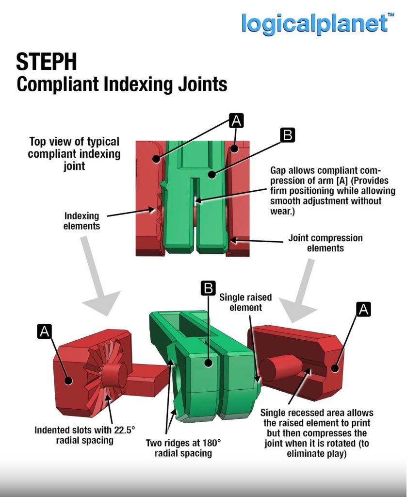 STEPH is built around a set of compliant, indexed mechanical joints that allow smooth motion while holding firmly in place.
