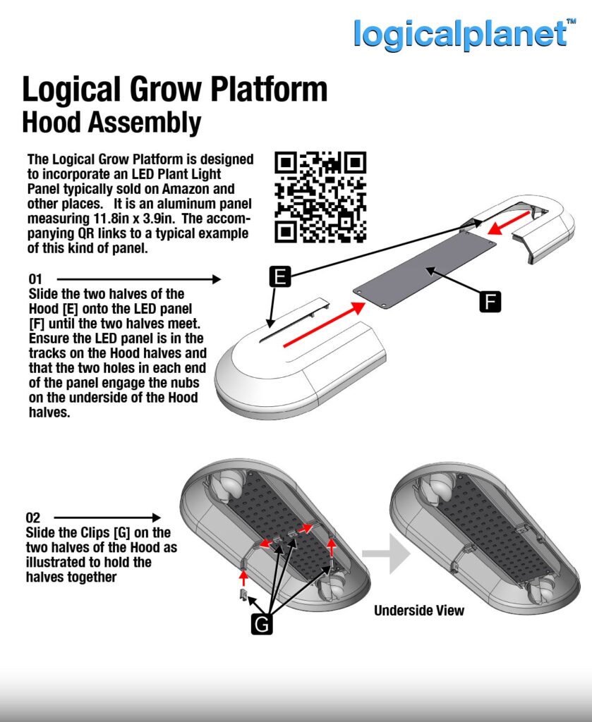 The two hood halves slide onto the LED panel and lock together underneath using printed clips.